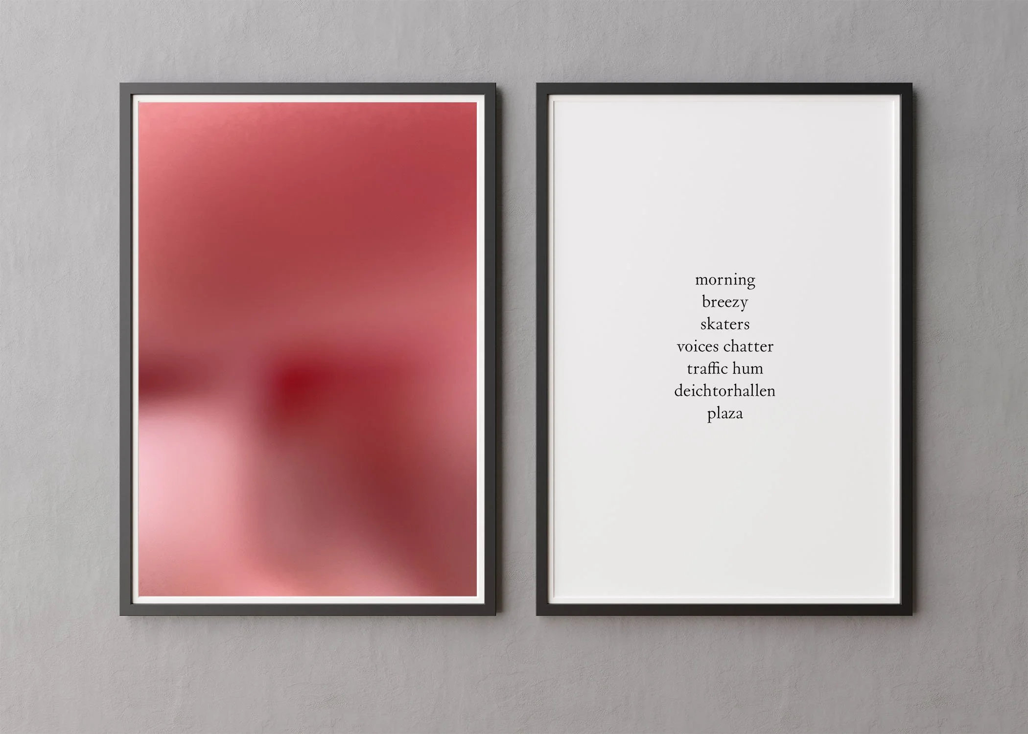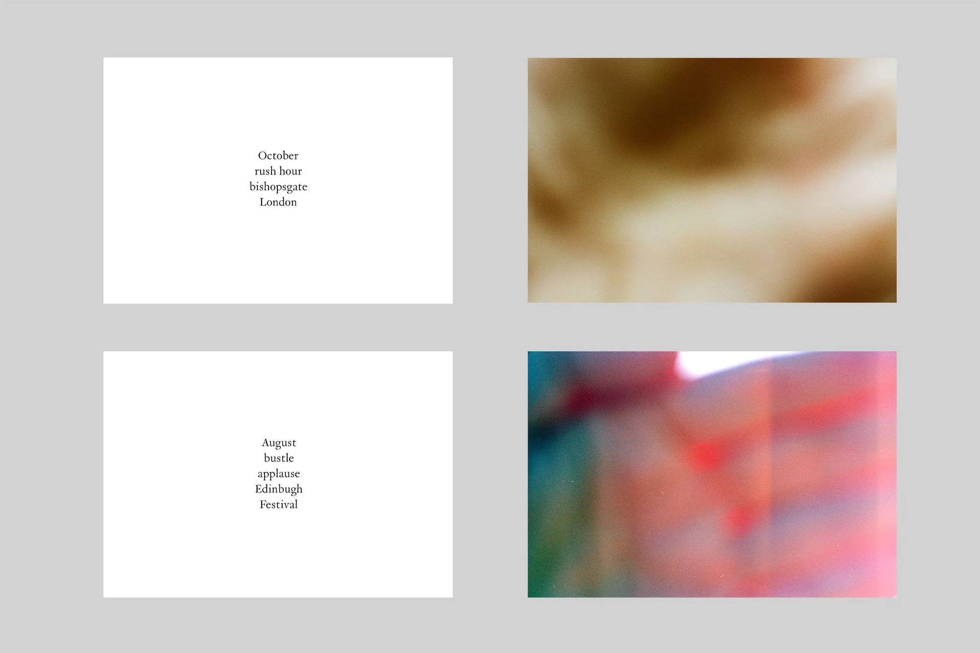 Words play a central role in this work. Here, text sits alongside each photograph as a diptych, evoking place, sound, and time. The text allows the viewer to fill in the gaps of what can’t be seen.